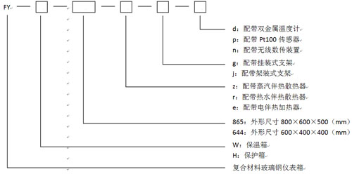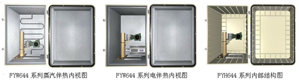 FY系列復(fù)合材料玻璃鋼儀表保溫/保護(hù)箱   復(fù)合材料玻璃鋼儀表保溫/保護(hù)箱采用不飽和樹脂添加玻璃纖維、氫氧化鋁和紫外線吸收劑等材料,經(jīng)過高溫模壓一次成型,再經(jīng)內(nèi)襯聚氨酯保溫層的方法制作而成;其材料特性賦予制品的防腐性能和保溫性,而機(jī)械強(qiáng)度、熱變形溫度等物理指標(biāo)都能充分滿足使用要求。   制品特點(diǎn)及配置   1、防護(hù)等級(jí):IP65   2、產(chǎn)品外觀顏色可按用戶需求訂制。   3、保溫節(jié)能:保溫箱保溫層采用15mm厚硬泡聚氨酯發(fā)泡料,保溫系數(shù)為0.23W/m·K,可比條件下節(jié)能50%。   4、防腐:保溫/保護(hù)箱箱體采用不飽和樹脂材料做基體,配料中添加了紫外線吸收劑并面涂聚酯漆等防護(hù)手段,可有效防止日曬、雨淋及工業(yè)環(huán)境的弱酸堿鹽的侵蝕。   5、免維護(hù):箱體無形變、無色變、無脫落層,使用期內(nèi)無需做任何保養(yǎng)和維護(hù),設(shè)計(jì)使用年限15年。   6、安裝方便、經(jīng)濟(jì):644型儀表保溫/保護(hù)箱可采用掛裝式安裝,經(jīng)濟(jì)簡(jiǎn)便,可節(jié)約安裝成本50%。美觀、堅(jiān)固。   7、溫度監(jiān)控裝置:保溫箱內(nèi)可預(yù)置測(cè)溫裝置:分雙金屬溫度計(jì)就地指示、Pt100有線信號(hào)傳遞、電子測(cè)溫?zé)o線數(shù)傳等三種方式。   8、配件齊全、免費(fèi)供給:   (1)配給6支過孔鎖緊護(hù)套,使導(dǎo)壓管、蒸汽供熱管等穿孔處密封美觀。  ?。?)配給1支連接撓性管接頭,方便撓性管連接及密封(防爆工況嚴(yán)禁使用)。  ?。?)644型儀表保溫/保護(hù)箱配給2支掛裝式安裝卡子,以便掛裝安裝使用。  ?。?)依據(jù)用戶提供的位號(hào)參數(shù)配給1支150×50×1mm不銹鋼位號(hào)牌。   箱體材料參數(shù)